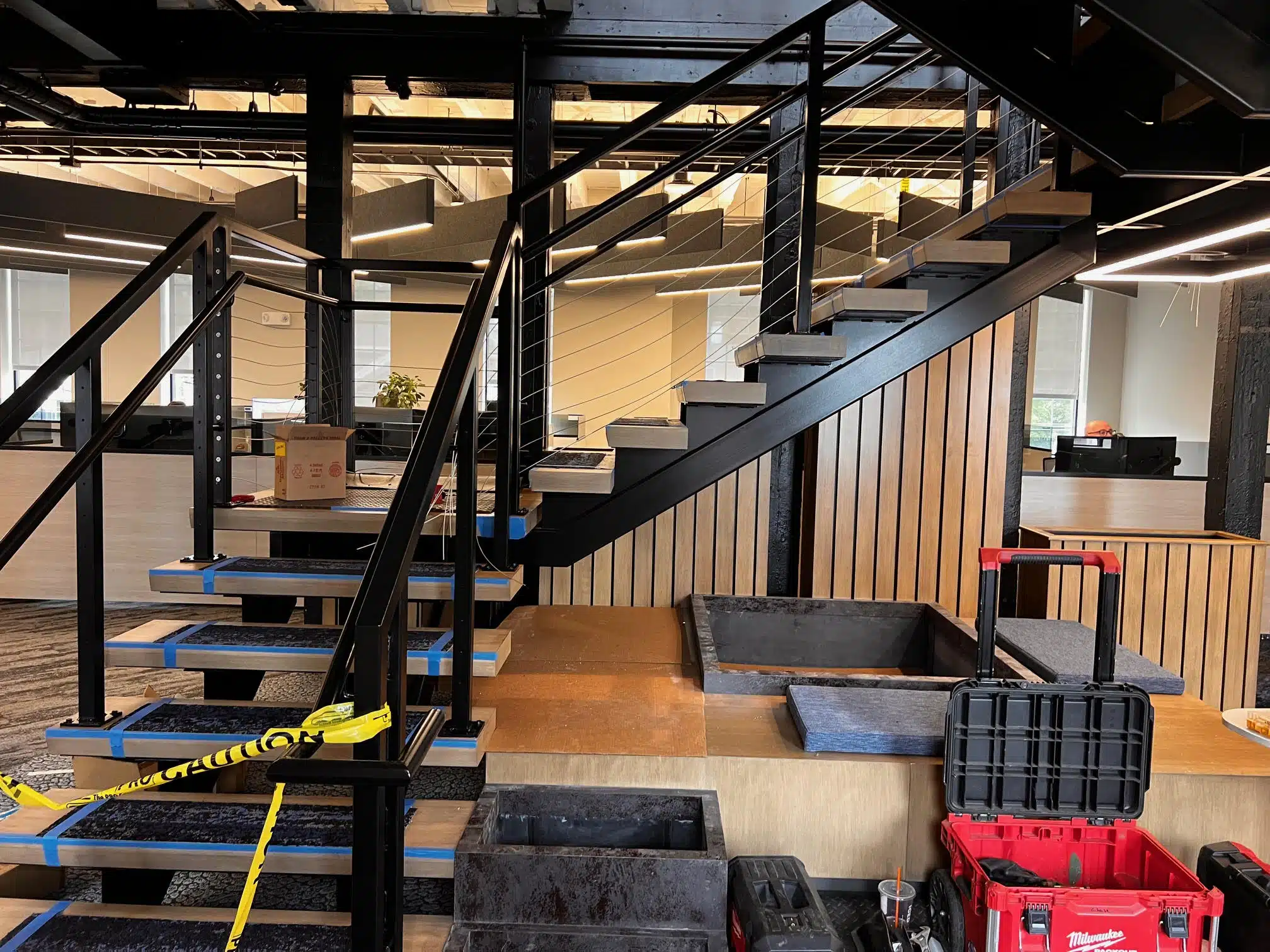 Macy designed, fabricated, and installed a new internal stair system with painted steel stringers, multiple landings, cable railings, and handrails throughout. The two-day installation allowed for seamless movement between floors while maintaining the business’s sophisticated aesthetic.