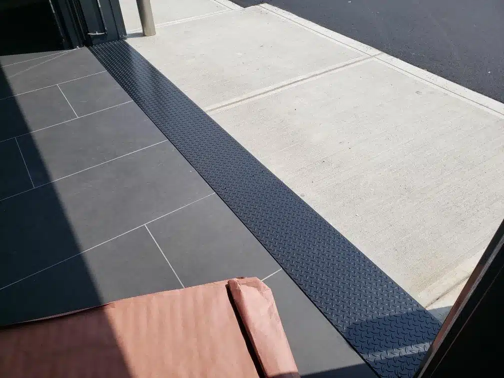 The transition between tile and concrete under multiple overhead doors required both durability (think harsh New England weather) and visual consistency. We fabricated and installed stainless steel diamond plates in varying thicknesses in these areas and finished each plate with black powder coating to align with Porsche’s sophisticated brand aesthetic.